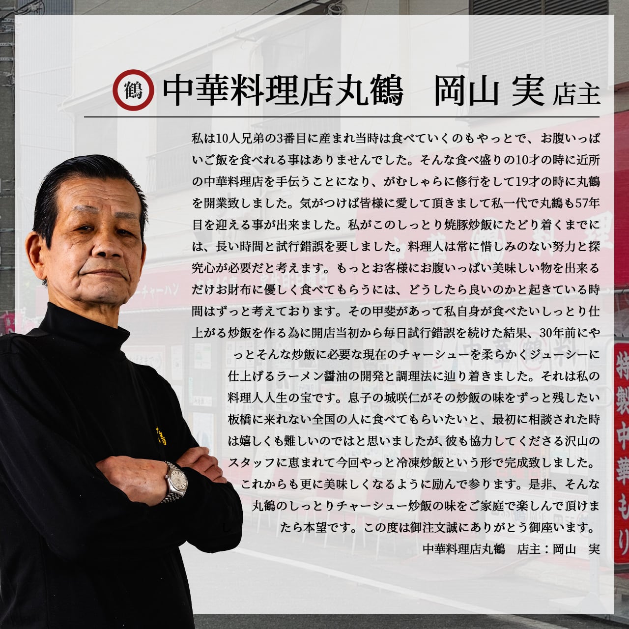 丸鶴店主岡山実監修、城咲仁企画、丸鶴冷凍しっとりチャーシュー炒飯がついに完成しました!親父が生涯をかけて築き上げた味を残したい、丸鶴の味を日本中の皆様に届けたいという僕の想いからスタートしたこの企画ですが、途中出来ないかもと思いました。そんな中、たくさんの方々のサポートもあり、思いが一つになり、やっと全国の皆様にお届けできるカタチになりました。